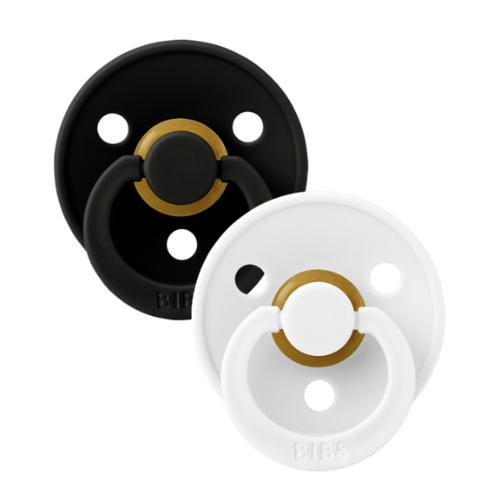 The Colour pacifier is the original BIBS pacifier and has been on the market for over 40 years. It has the signature round BIBS shield with three vent holes and round BIBS engraved handle ring.
