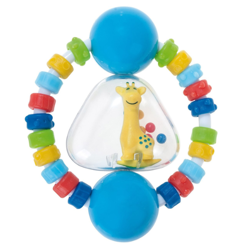 A colourful rattle with a flexible giraffe teether will surely interest every toddler. It will be easy for your child to hold it in their hands. It has movable parts that will encourage your toddler to exercise and play. It has slightly rounded shapes. The transparent parts of the toy contain small, colourful elements that move during play and make a pleasant rattling sound. Soft, flexible biting elements will bring relief to your baby during teething. Intended for children aged 0 m+.