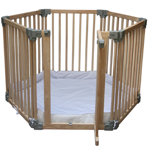 Clippasafe Natural Wood Playpen has six parts, all made from natural and sustainable beech wood.It can be built as a six-sided playpen and comes complete with a washable fabric base for use in this configuration.Alternatively, the gate part can be used on its own as a stair gate, including wall fixing, or four sections can be used to make a compact travel cot. It can also be used as a fire surround or a room divider.The door section has a slam-shut feature that enables easier access to the parent to the child. Folds flat to store when not in use.