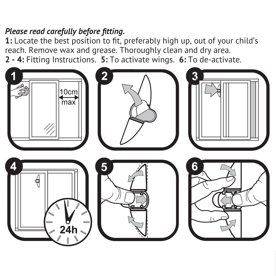 Easily fitted to limit the open position of a sliding window or door. Helps to prevent a child from passing or climbing through a gap. Easily activated by a sliding switch. Two actions required to deactivate. When deactivated the wings lie flat and the door can be opened.