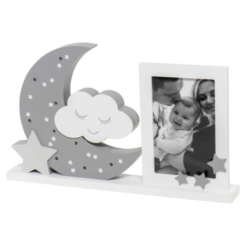 Moonlight frame photo frame Of course, you want to capture your child’s precious moments, such as the birth, his or her first birthday or one of those beautiful smiles. You will want to see your most beautiful photos all the time, day and night, and this Moonlight frame, a beautiful photo frame with LED lights, will do the trick! Buying a photo frame. Which one will you choose? Taking a photo is easy and quick these days, everyone has a smartphone with a camera. The technology also ensures that the quality of the photos continues to improve. Moonlight frame photo frame is specially designed to give your most precious photos more attention. This photo frame consists of a moon, a sweet little cloud with a face and a little star. Photo frame with lighting The photo frame holds pictures of 10 x 15 cm. The special thing about this photo frame is that the moon contains 9 small LED lights, so that the stars really shine around your child. Thus, with this Moonlight frame photo frame, you have a kind of lamp that spreads a fairy light in the baby’s room or living room. Moonlight frame as maternity present The Moonlight frame photo frame is made of MDF wood and comes in a nice gift box. So it is also a great maternity gift to give or receive!
