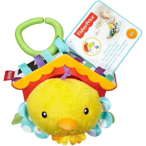 Take cause and effect learning on the go with a cute, linkable little bird toy for newborns. This plush birdie features a bumbling, wiggling motion that helps introduce action-reaction. Baby pulls the birdie to make things happen! Sensory-boosting details like jingle sounds, soft “grass” and ribbon details provide auditory and tactile stimulation. Bold black and white patterns on the roof are easy for even the youngest babies to see.