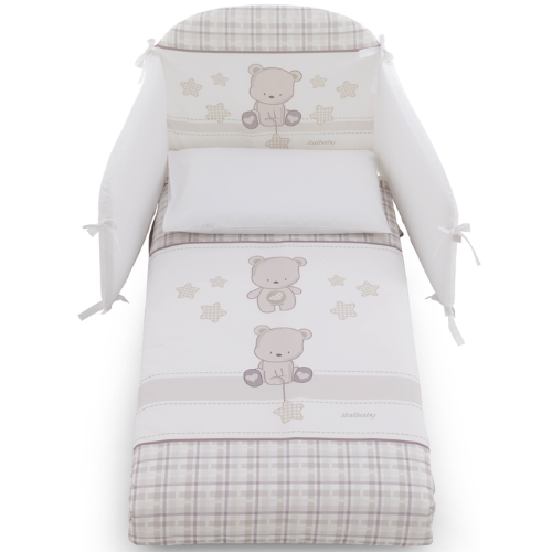 The complete set is composed of a removable duvet, 3-sided bumper and pillowcase. The coverings are in 100% cotton with a polyester fiber interior embellished with handcrafted embroidery or personalized prints depending on the model, equipped with non-toxic dyes indicated specifically for children’s textile products.