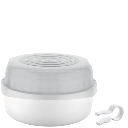 Suitable for the sterilisation of all MAM bottles, teats, and other baby products, the MAM Microwave Steam Steriliser not only ensures quick and safe sterilisation of warm and cold water at home, but is also ideal for use on the go thanks to its compact size and smart design.The steriliser fits up to six bottles with components, and can be flexibly arranged on two levels. The steriliser fits in most commercial microwaves, with a diameter of 11 inches/28 cm and a height of 6.5 inches/16.5 cm..Thanks to specially designed grooves, the lid can be used as a drainer for sterilised items.The base includes a level mark for exact and easy filling, and can be used for cold water sterilisation